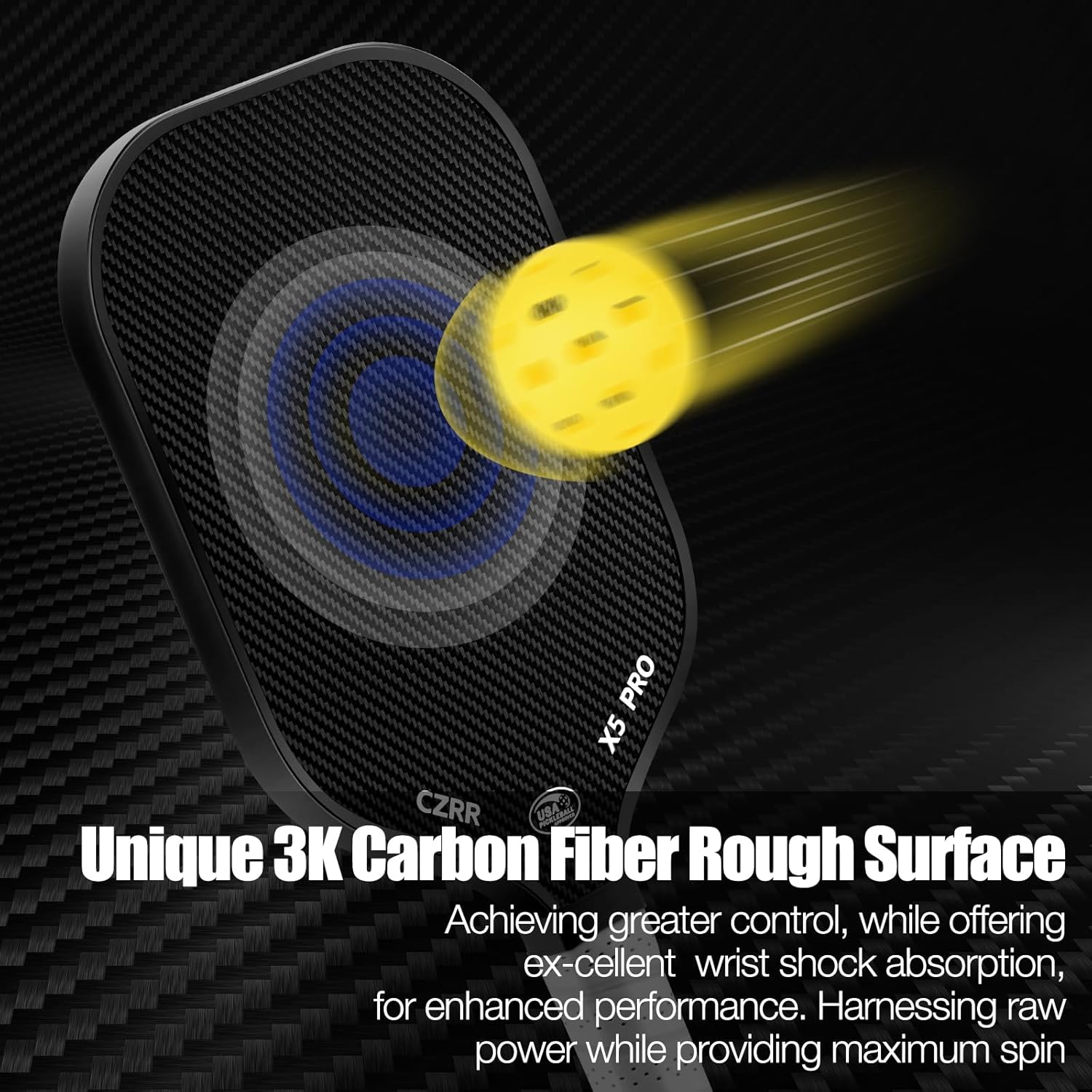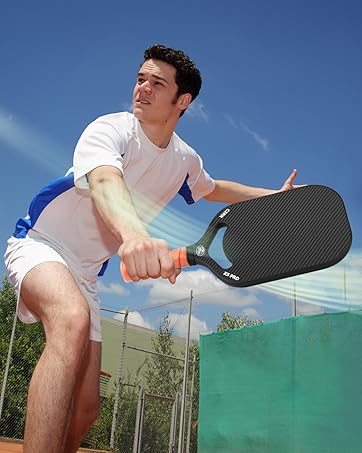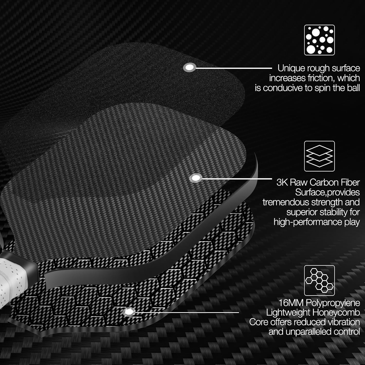 【CARBON ABRASION SURFACE (CAS)】 Advanced Based CARBON ABRASION SURFACE (CAS) + 3K Raw Carbon Fiber Surface (CFS) material, increases its friction, and prolongs the residence time of the pickleball on the racket face, harnessing the raw power with maximum spin & ball control.