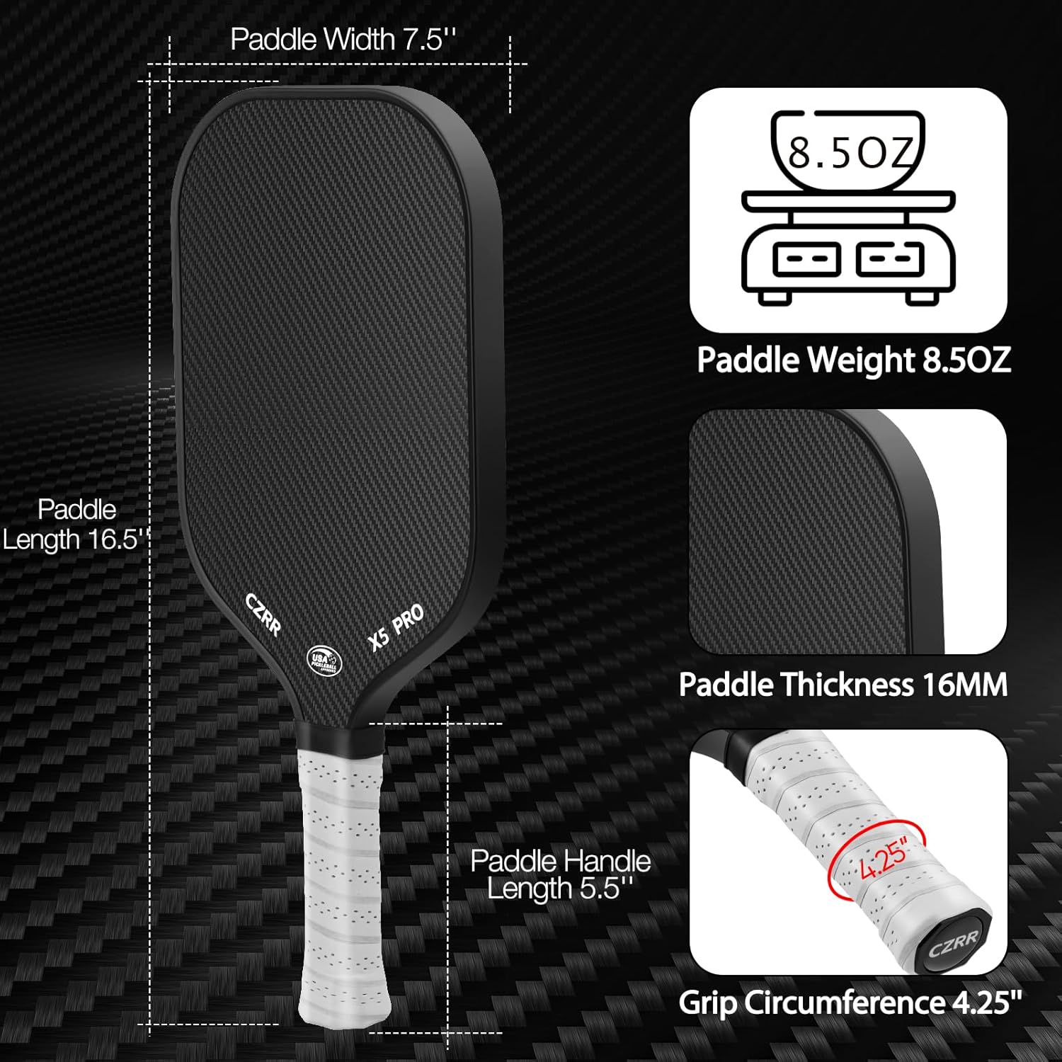 【Professional Advanced Racket Size】 Carbon fiber pickleball paddle with extreme strength & stability. Stands up to aggressive play & keeps the paddle consistent across its life. Length 16.5″ Width 7.5″ Weight 8.5oz., Extend grip size Grip Length: 5.5″.
